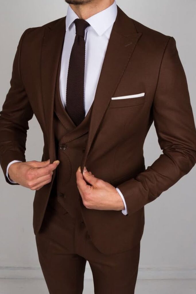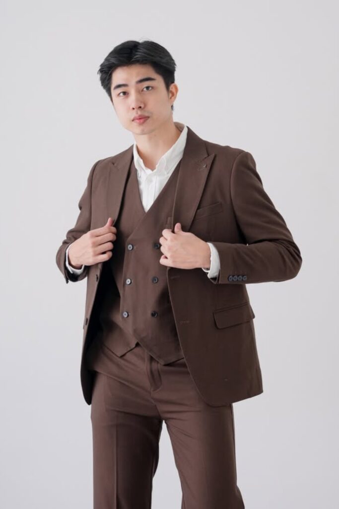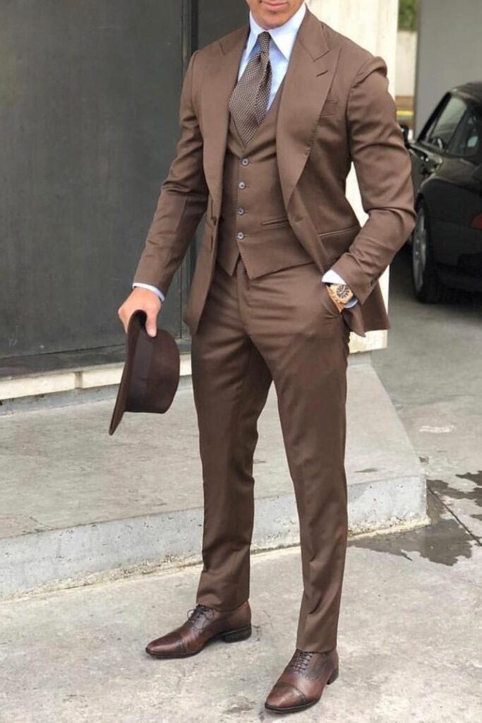 The fitting vest and neat lapels on the brown three-piece suit make it look more authoritative without making you look too formal or out of style.