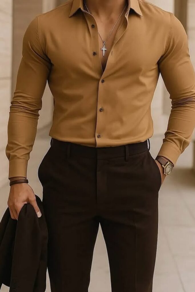 Warm shirts make the transition from one color to another seamless, so darker brown pants can stand out without being too loud or contrasting in the evening.