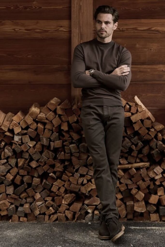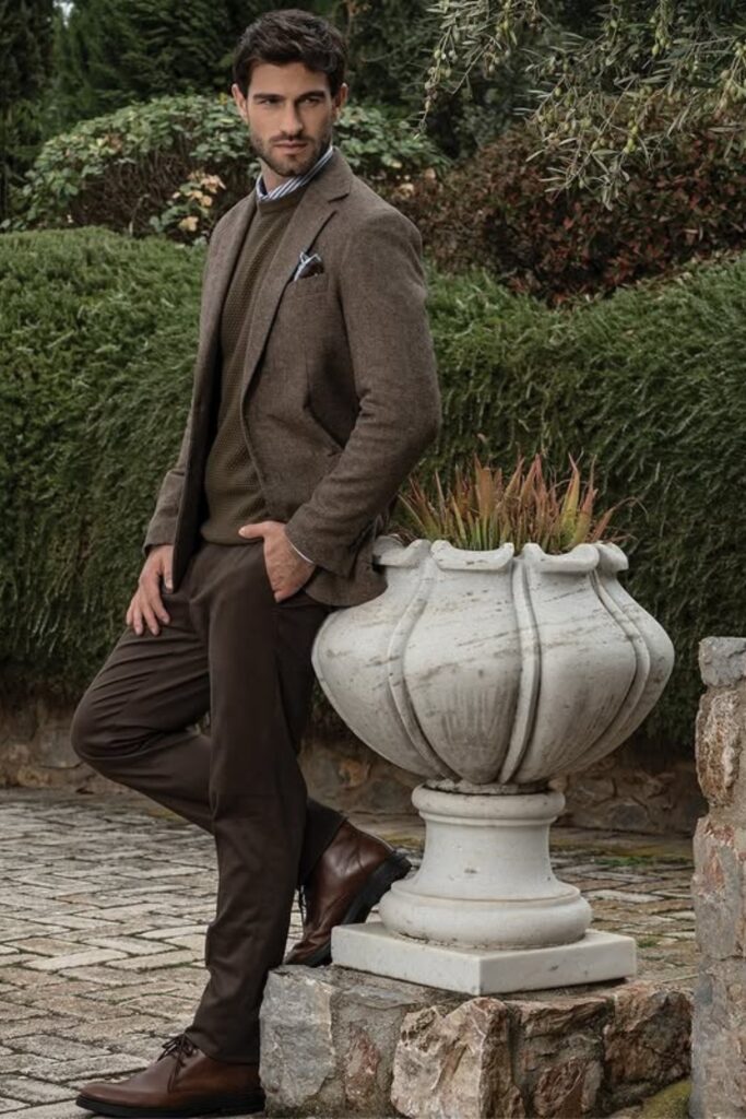 When you wear knit textures with brown suits, they look deeper and more intriguing. This is a simple way to keep the look cozy, current, and interesting.