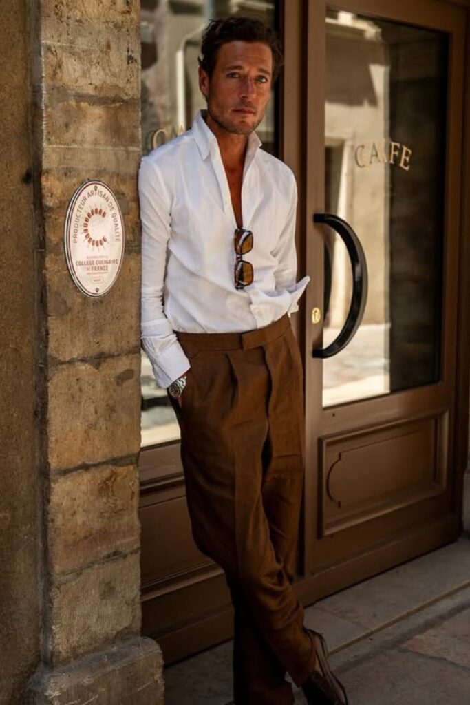 White shirts with crisp edges make brown pants look sharper right away. This creates a comfortable yet purposeful contrast that works for everyday city or trip attire.