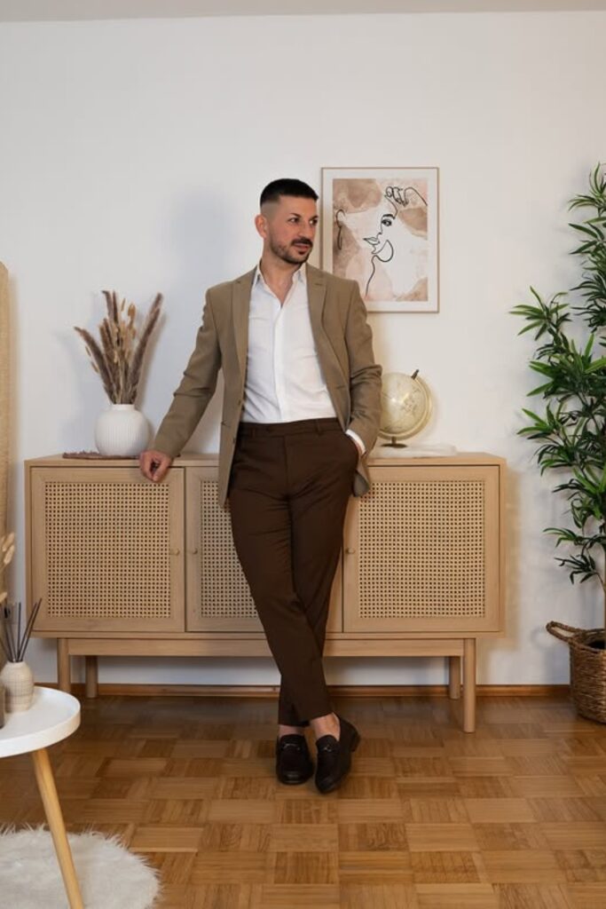 Soft neutrals inside really make brown pants stand out, especially when worn with fitted jackets and casual loafers for a peaceful lifestyle.