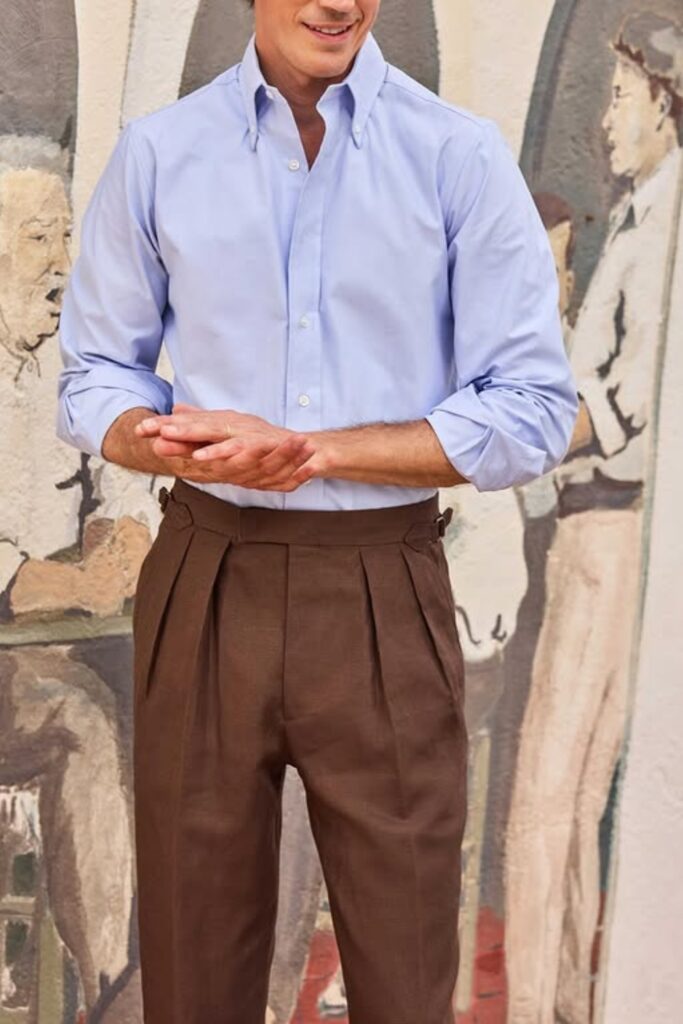 Brown pants instantly make a blue shirt look more relaxed, making the outfit look professional enough for work or social events while also being friendly.