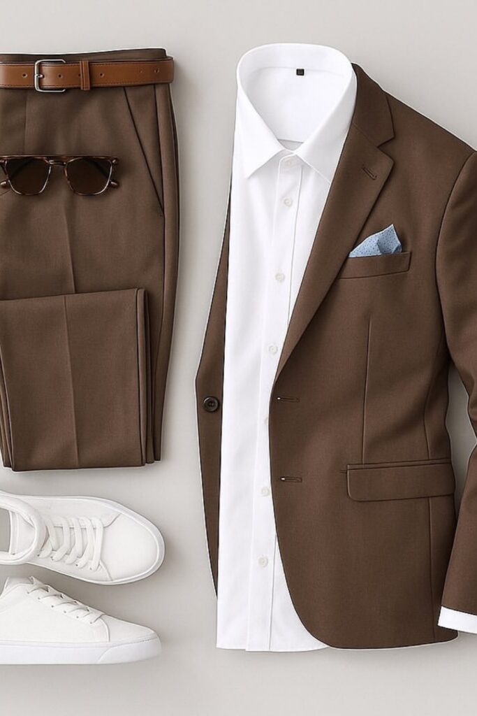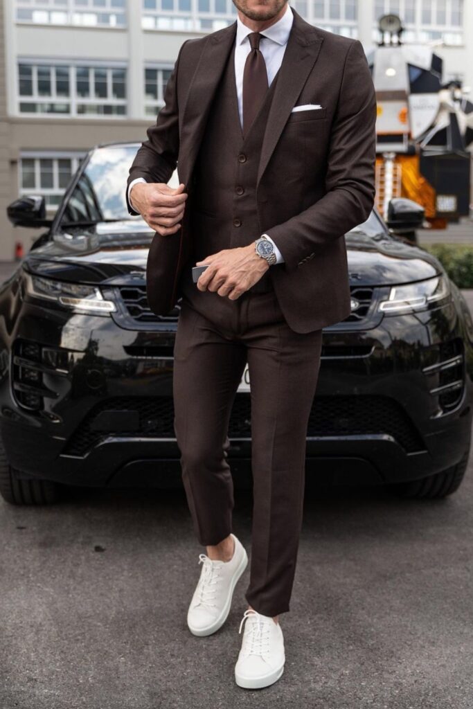 White sneakers transform brown tailoring totally, making it look like a sharp smart-casual ensemble that is both current and comfortable.