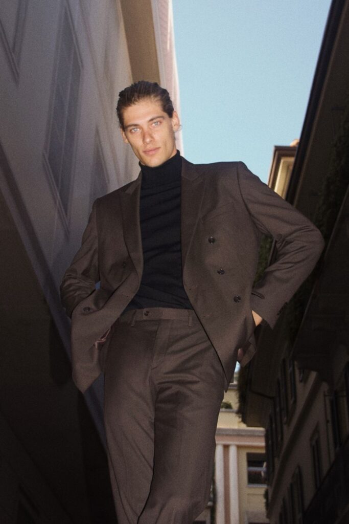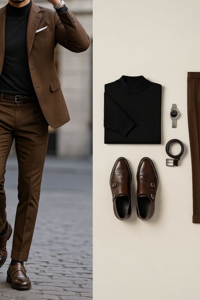 Black turtleneck under a brown suit gives tailoring a modern look right away. It makes the ensemble look sleek and planned without needing a tie.