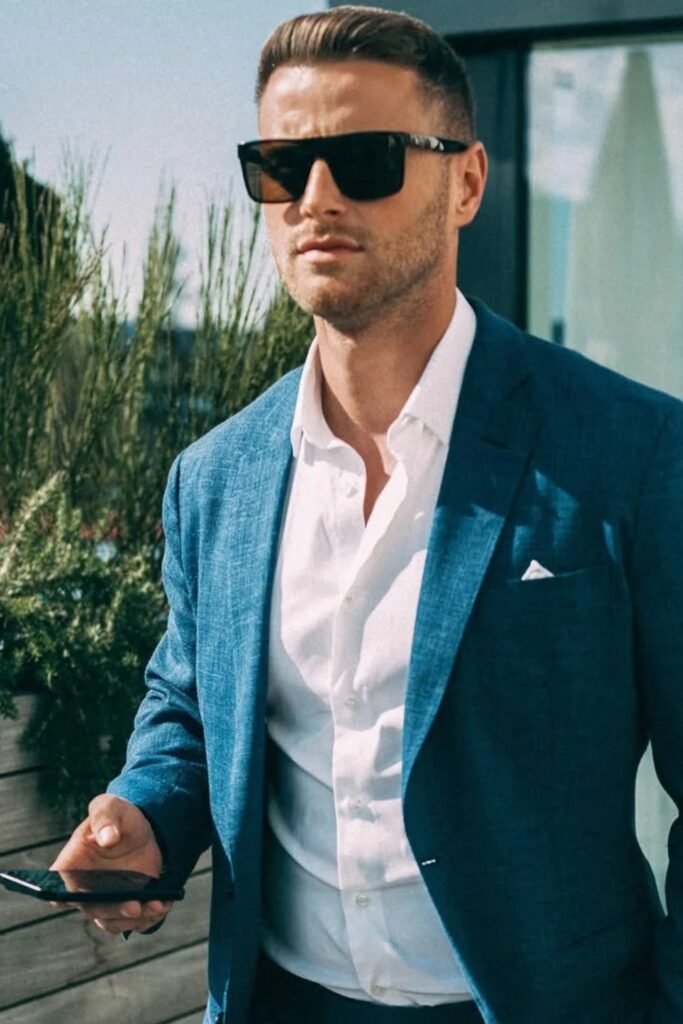 Open-collar shirts under textured blazers make business casual more comfortable while yet looking sharp enough for meetings or when you’re with clients.