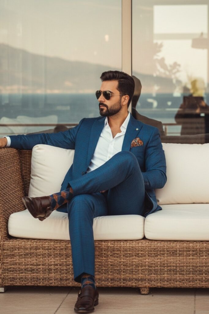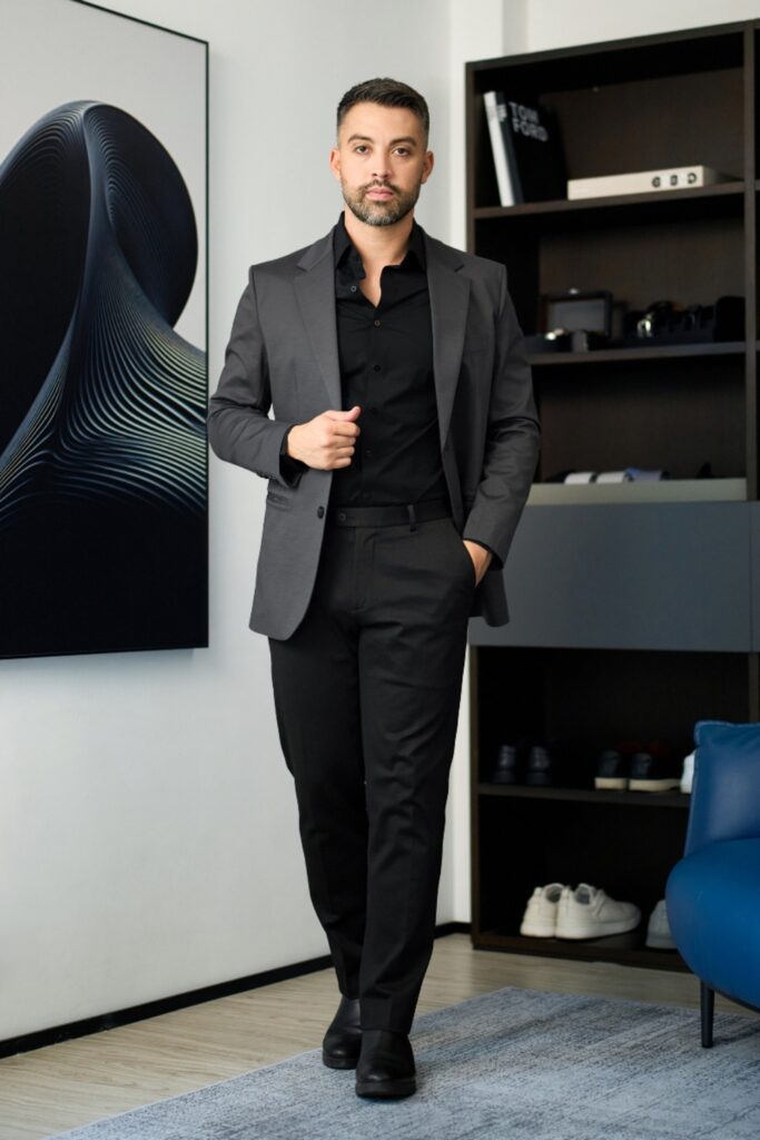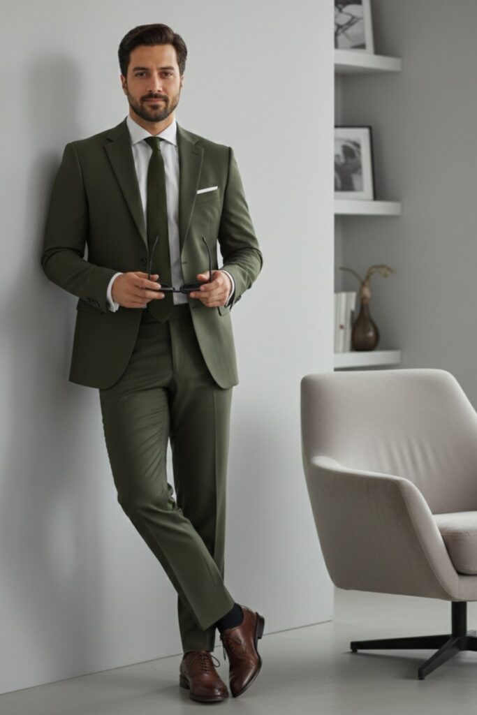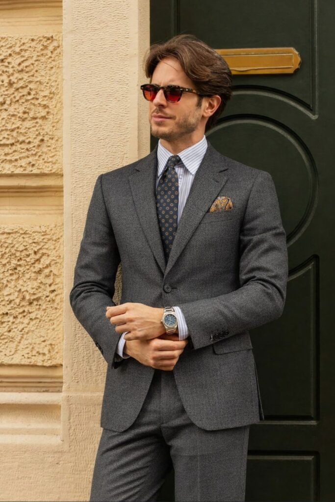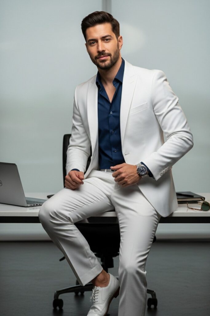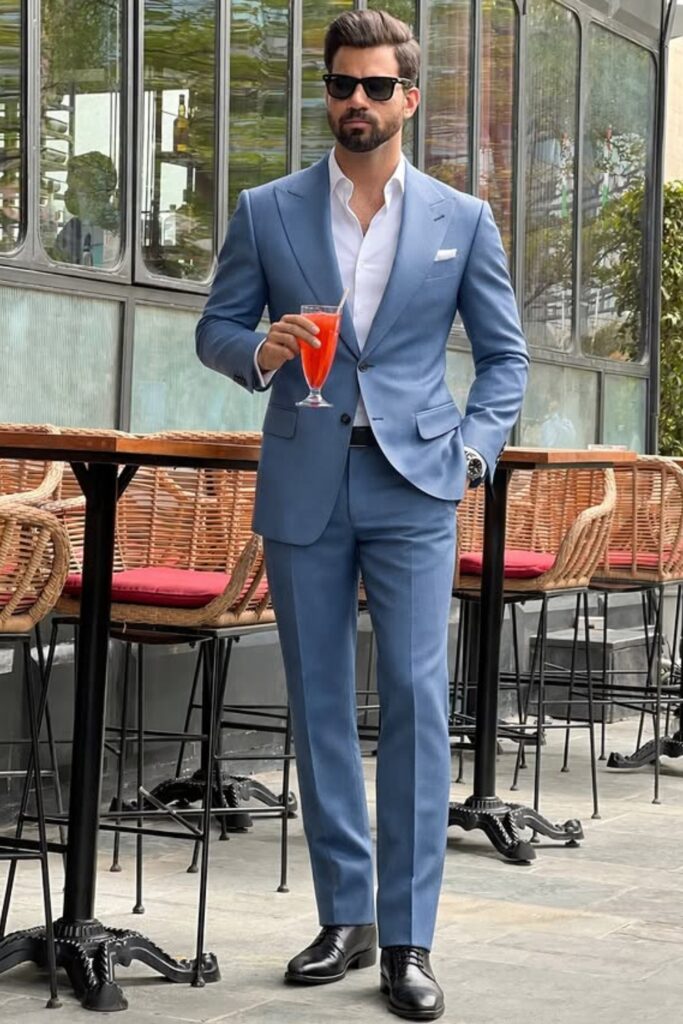 The outfit stays sharp with sleek loafers and little accessories. The suit’s clean lines and fitted fit do most of the work.