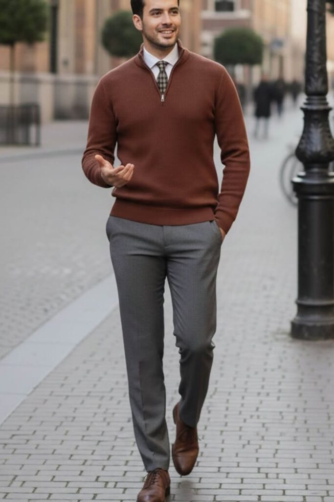 Quarter zip knits are warm and polished at the same time, which helps business casual look put-together while still being able to move around during long days of walking.