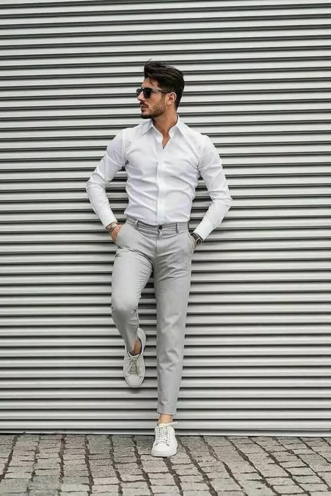 When worn with fitted pants and simple sneakers, crisp white shirts make business casual outfits look sharper for modern offices in the city.