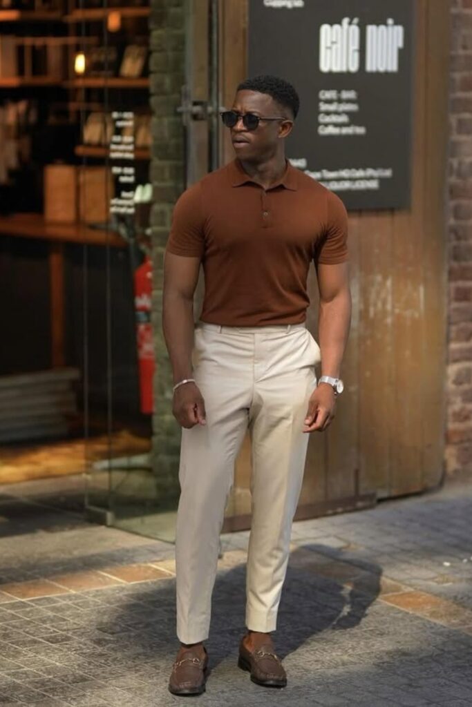 A fitting knit polo is a great way to look business casual without being stiff. It keeps you comfortable during long workdays while still looking sharp.