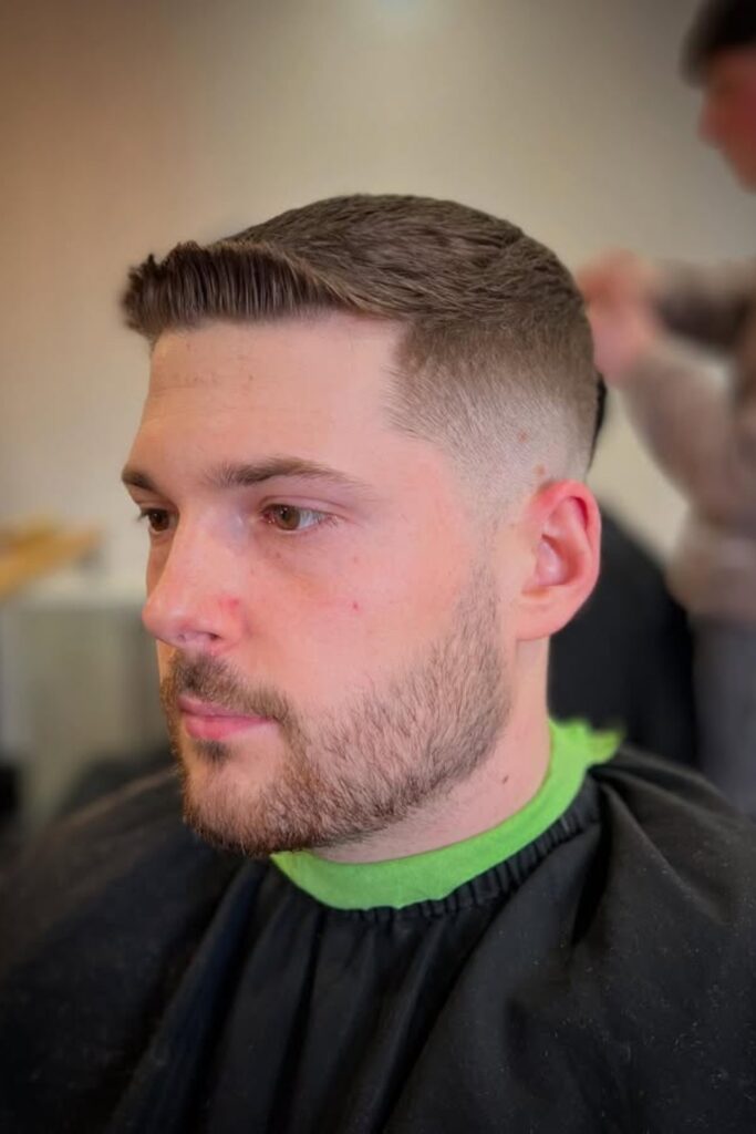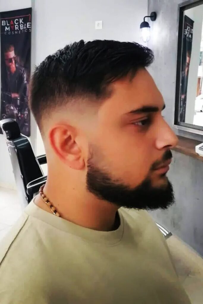 The fade blends in perfectly with the beard, and the top stays long enough to give it a natural brush-forward style. It’s great for guys who want something tidy but not too short.