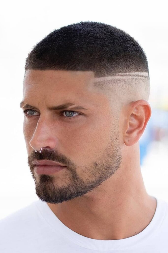 This variant of the classic crew cut has a crisp hard part and a clean razor design across the fade that gives it an edge.