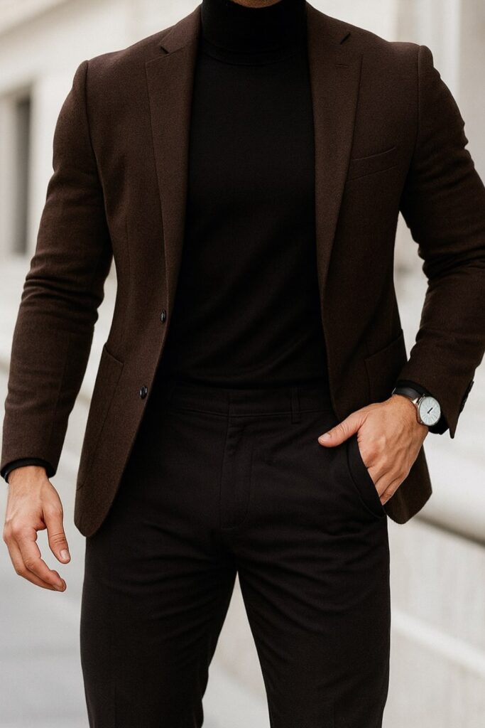 When you wear a brown blazer with a black basis, you keep the contrast under control and give depth that pure black sometimes lacks in practice.