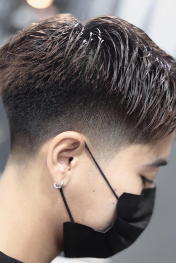 The layered two-block fade combines a clean, precise look with a laid-back Korean edge. The sides and neck are cut short, while the lengthier, lighter layers on top blend in perfectly.