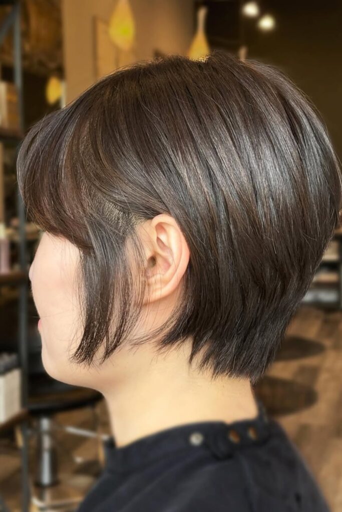 This layered bowl cut is sleek and balanced, giving it a sophisticated, boyish style that works with both casual and streetwear outfits.