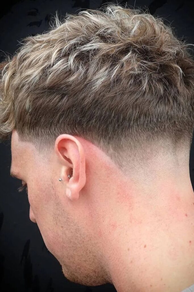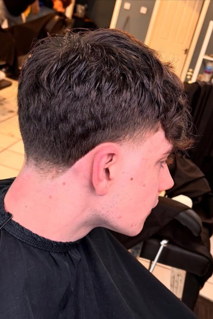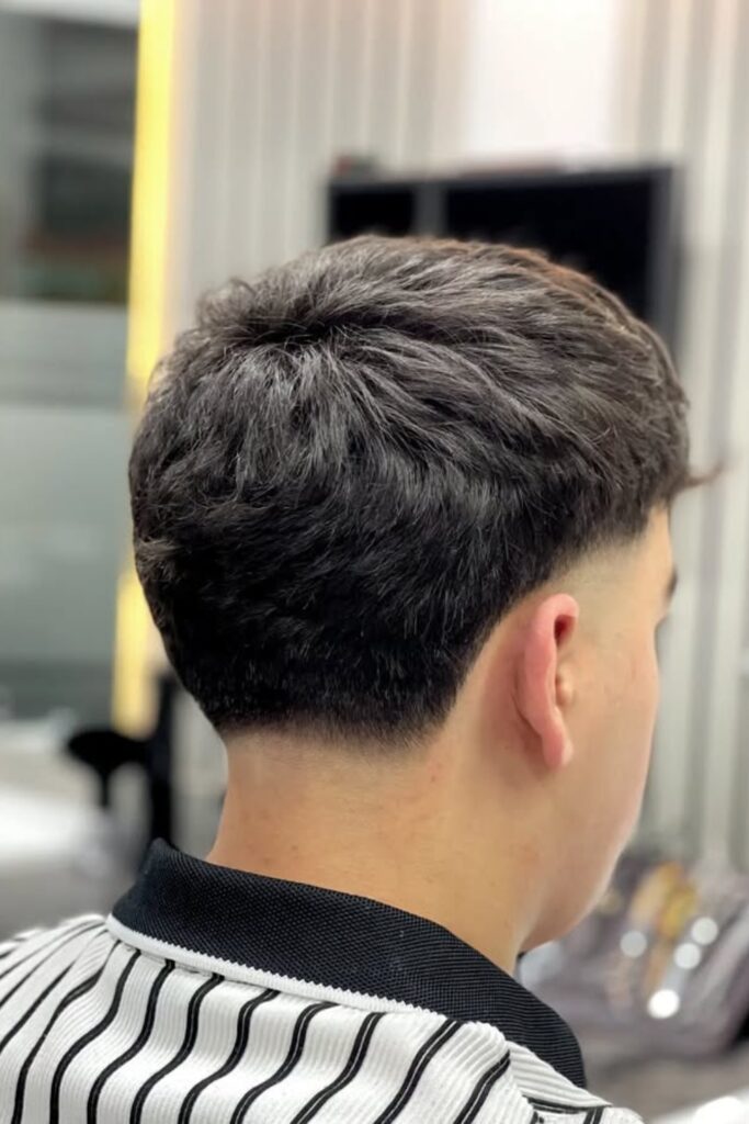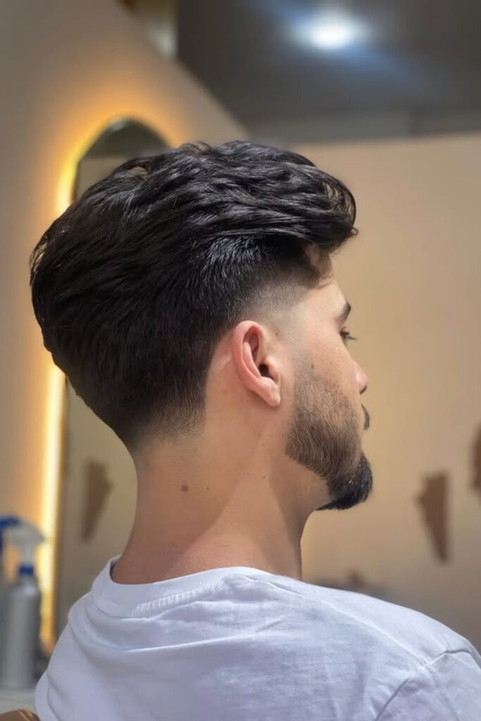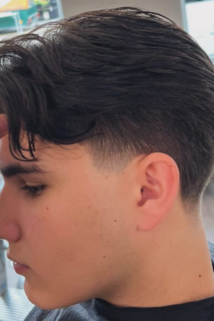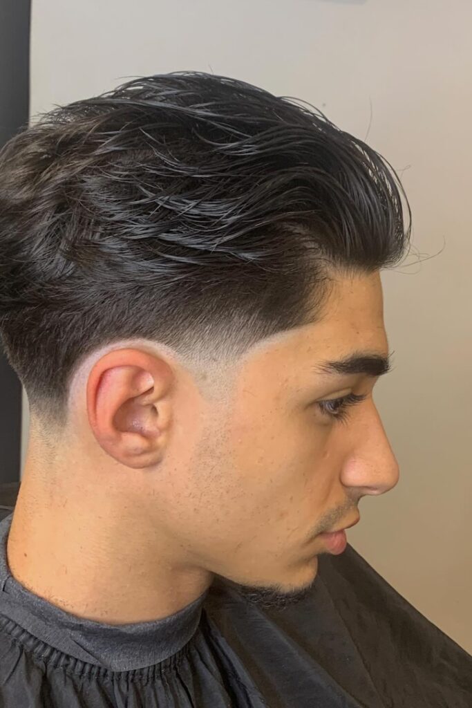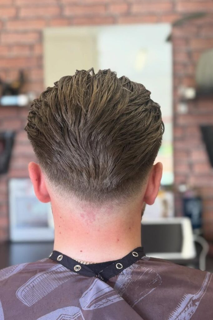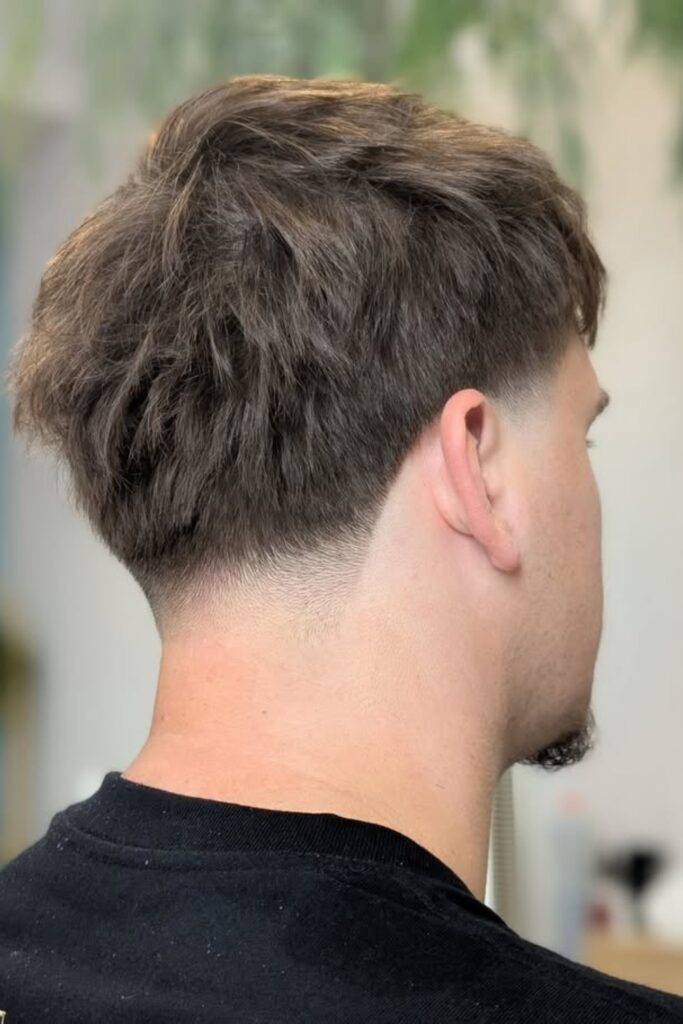 The sides fade softly into the skin, keeping the outline tidy. The top stays longer and naturally rises for a windswept look.
