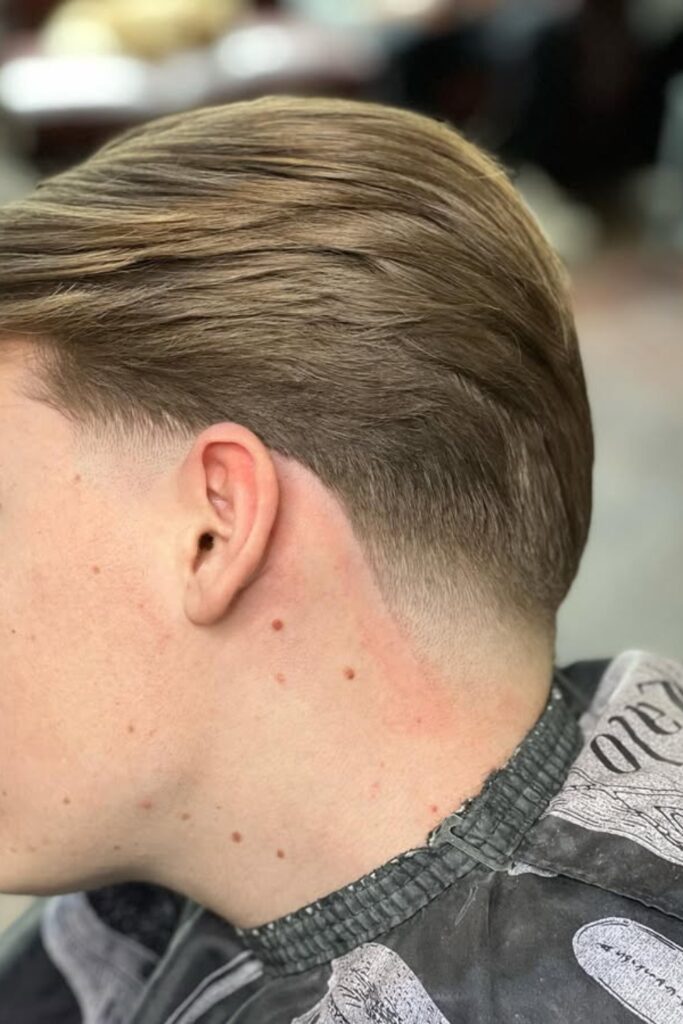 The fade is low, just above the natural hairline, so the change isn’t too obvious. It doesn’t go up high into the temples like a mid taper.