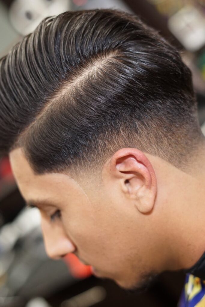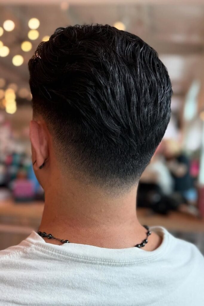 The short fade on the sides makes the transition to the fuller top smooth, and the back is slicked back for a polished look.