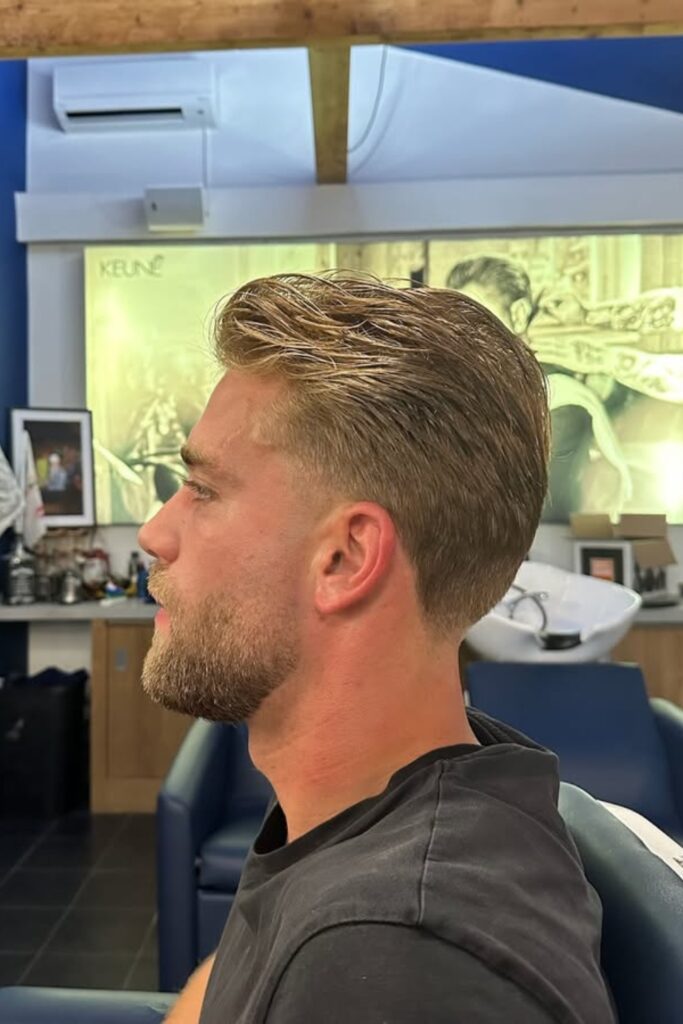 The precise side sweep with a crisp low fade gives you a striking but natural look. The low fade makes the edges tighter and the side profile brighter.