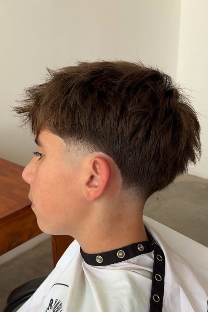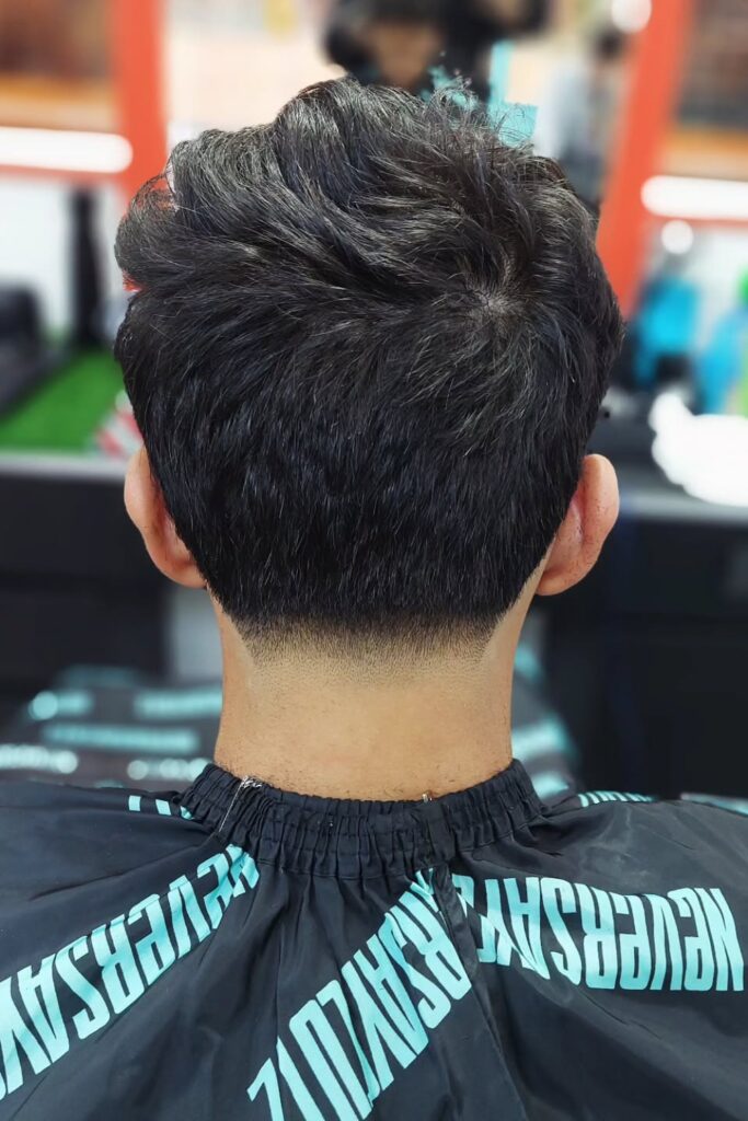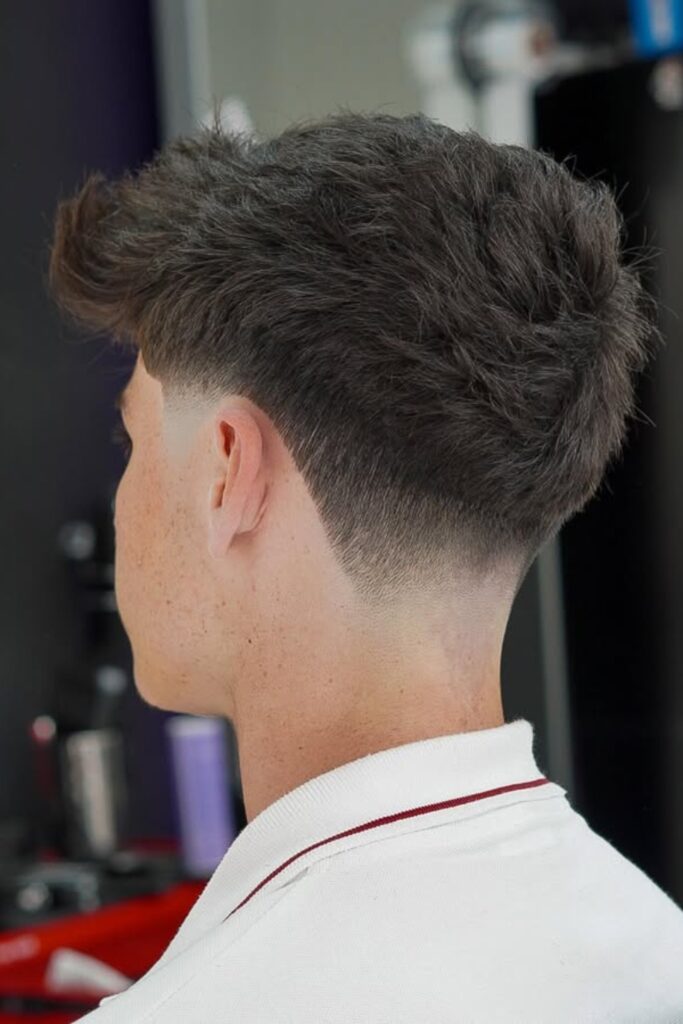 The short fade on the sides and back gives the look a neat finish, while the jagged, ruffled top gives it a youthful feel with a lot of movement.