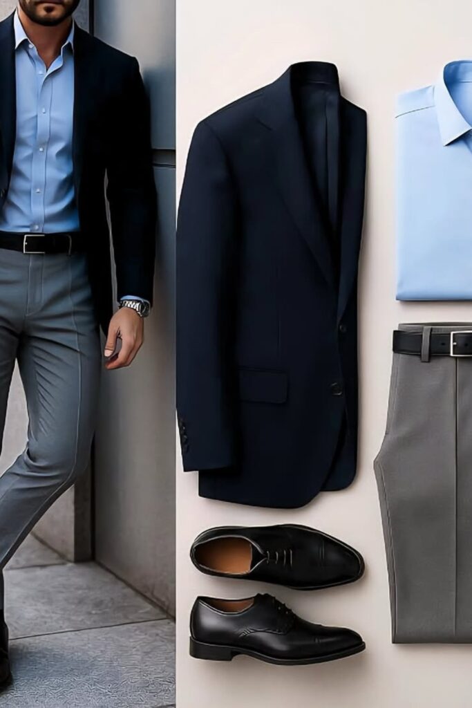 Grey tailored pants balance off the richness of blue, keeping the look grounded, refined, and appropriate for today’s business casual environments.