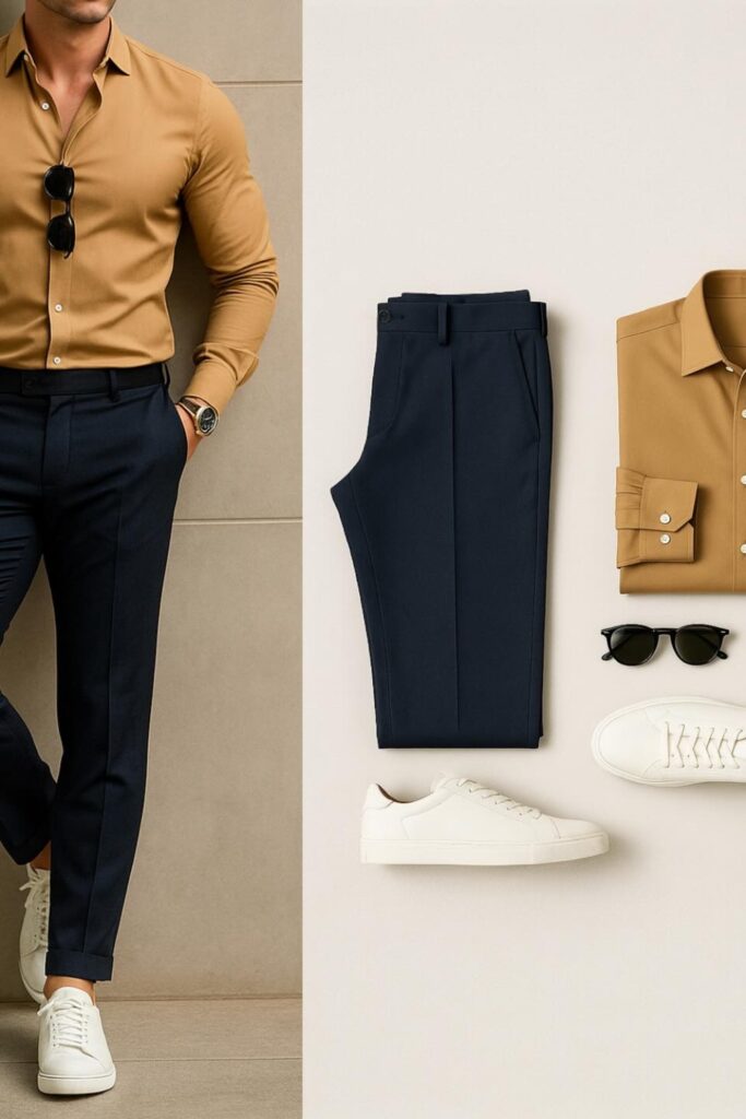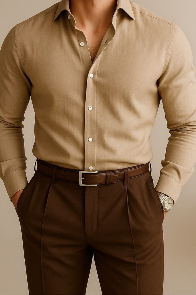 A tan shirt adds warmth without being too loud, especially when worn with darker pants that visually ground the whole outfit.
