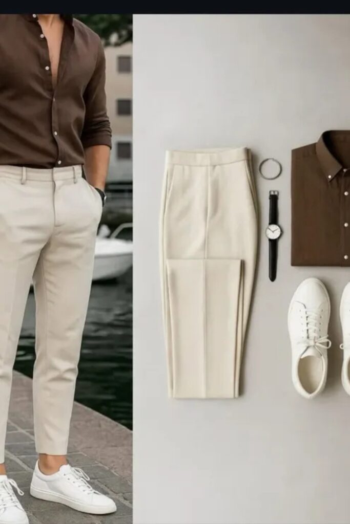 Deep brown shirts give cream pants additional depth, making neutral combinations feel more planned and luxurious for everyday office wear.