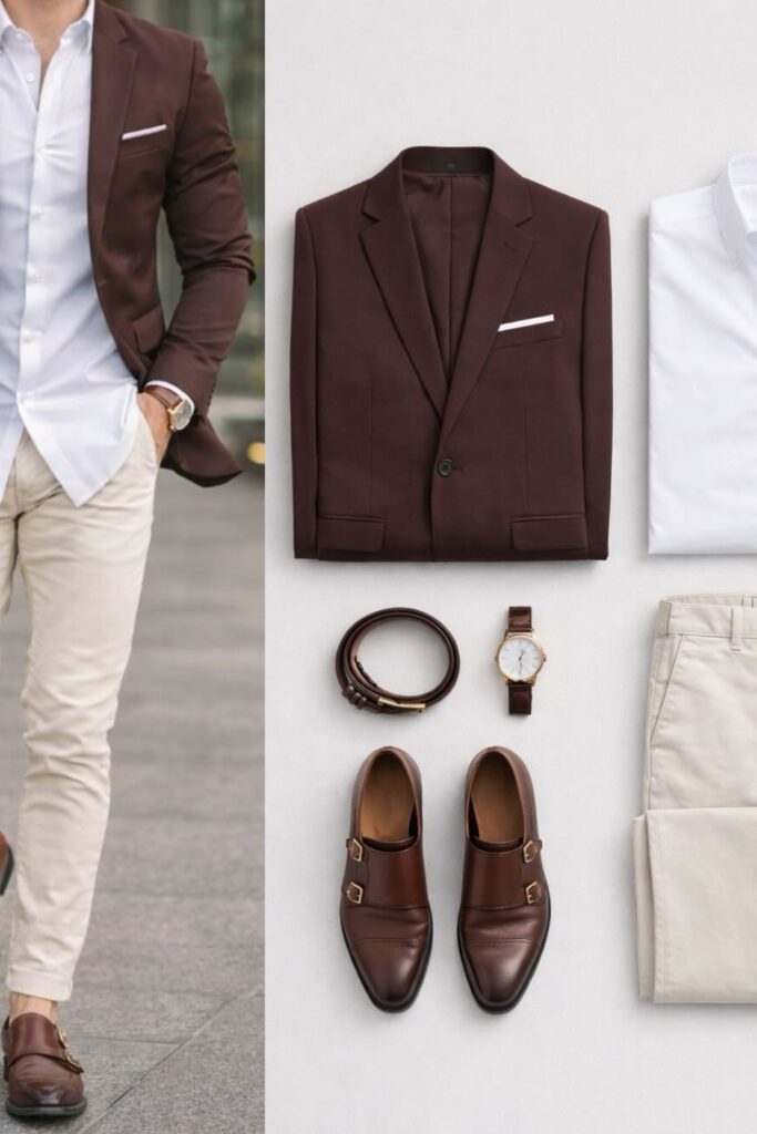 Brown leather shoes add warmth and maturity, making this look sophisticated enough for everyday work settings without looking like you’re trying too hard.