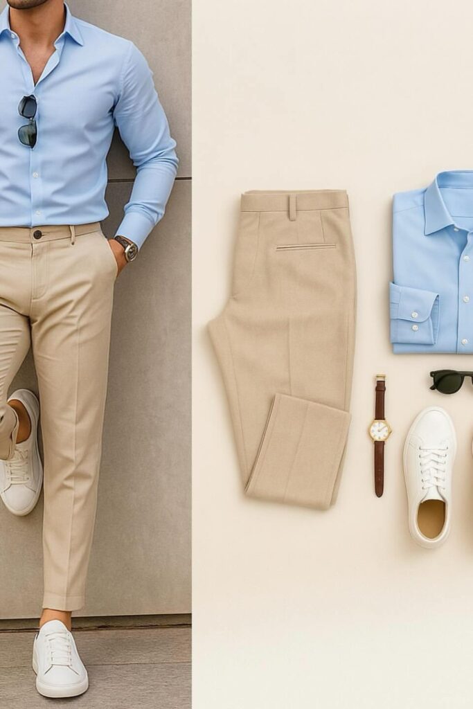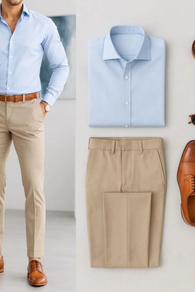 Beige pants with a light blue blouse make a simple office outfit that looks clean, modern, and easy to put together.