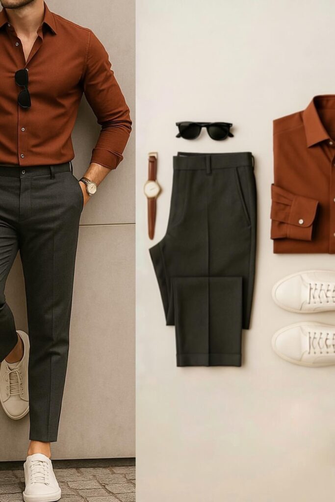 When paired with darker pants that level the look, warm rust tones add personality to professional attire.