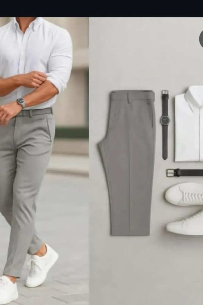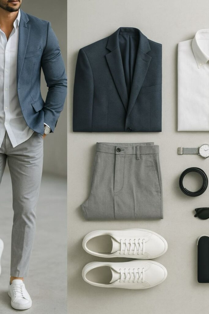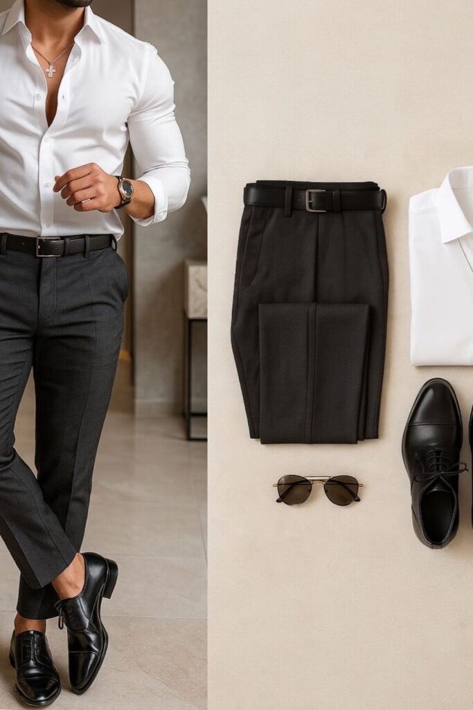 This pairing benefits from slim tailoring, ensuring the outfit reads professional even with lighter colors involved.