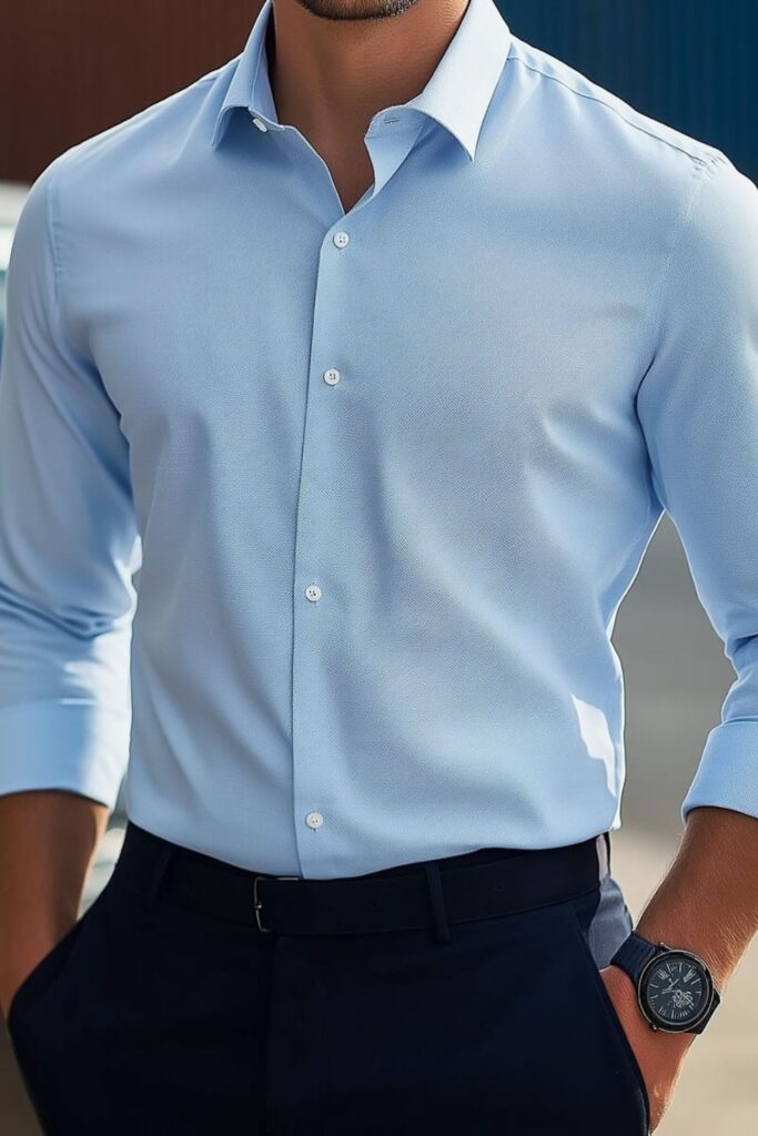 A bright blue shirt makes professional clothes look clear right away, especially when paired with darker pants.