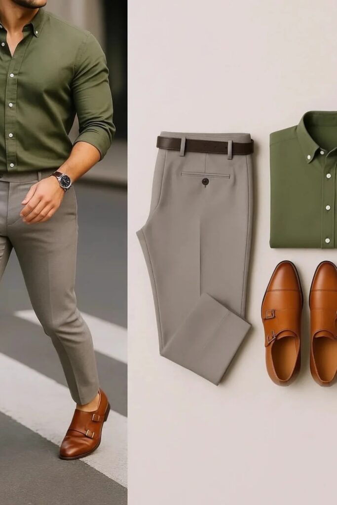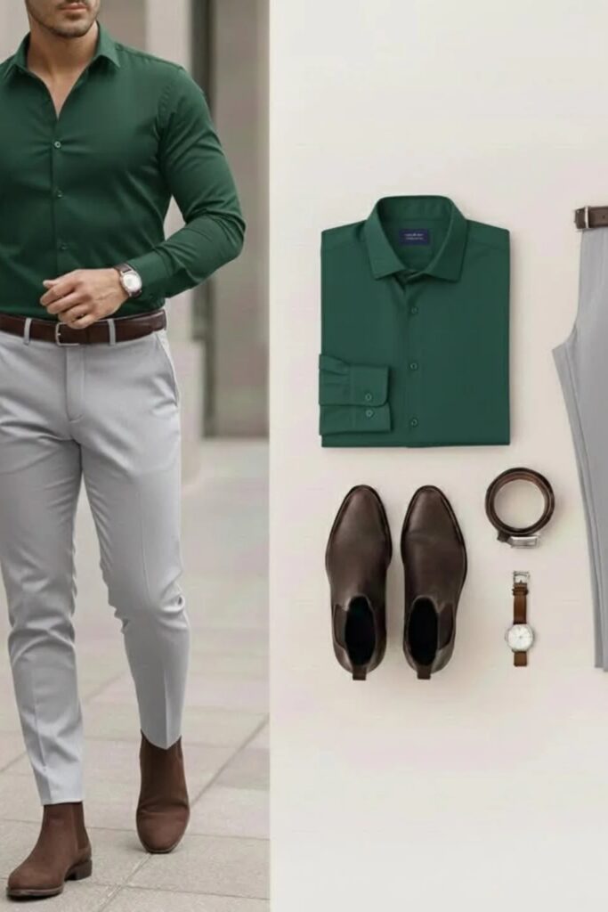 When you wear deep green shirts with light grey pants, you feel confident but in control. The pants maintain the look grounded and professional.