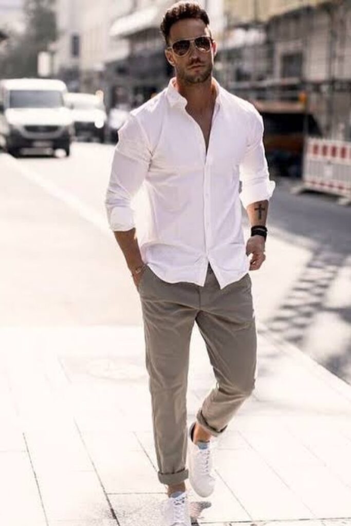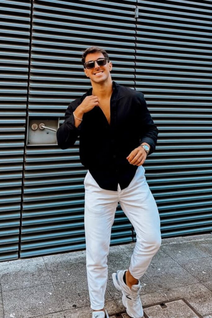 White pants seem bold here because they fit well and let the contrast work without making the outfit appear loud or forced.