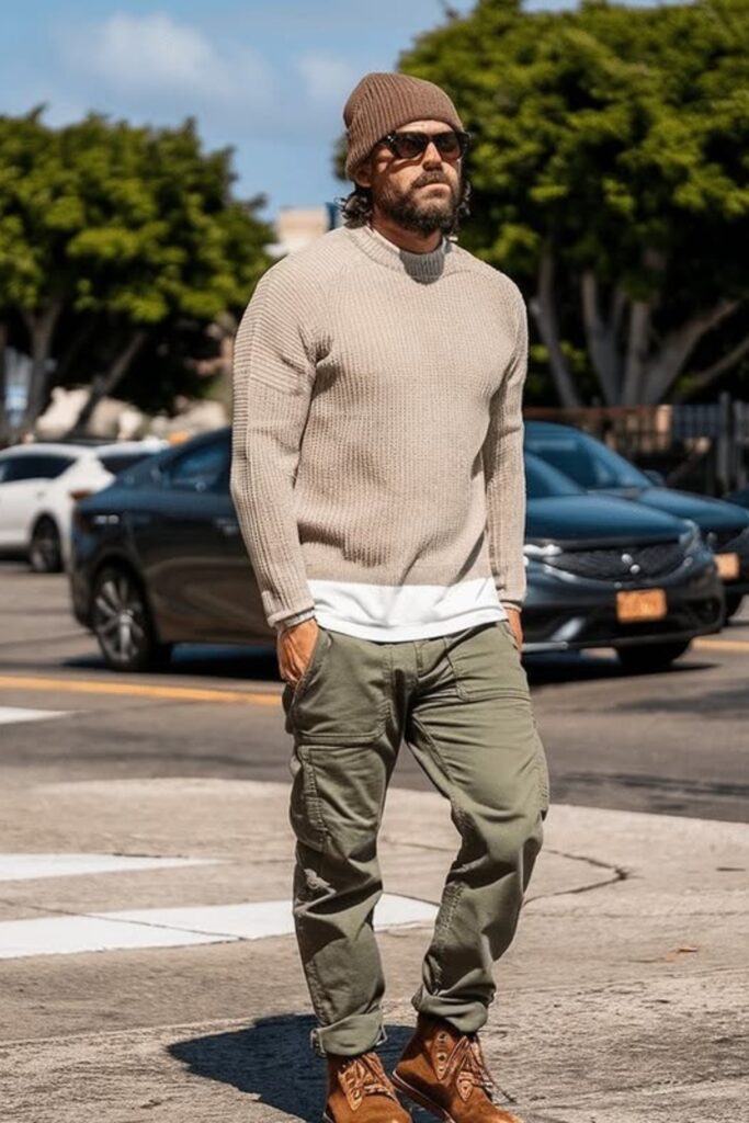 This ensemble is all about texture, with knits and cargos adding depth without any bright colors or clear branding.