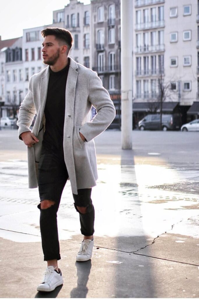 This outfit is all about contrast, with distressed denim and a crisp coat that make everything look planned instead than random.