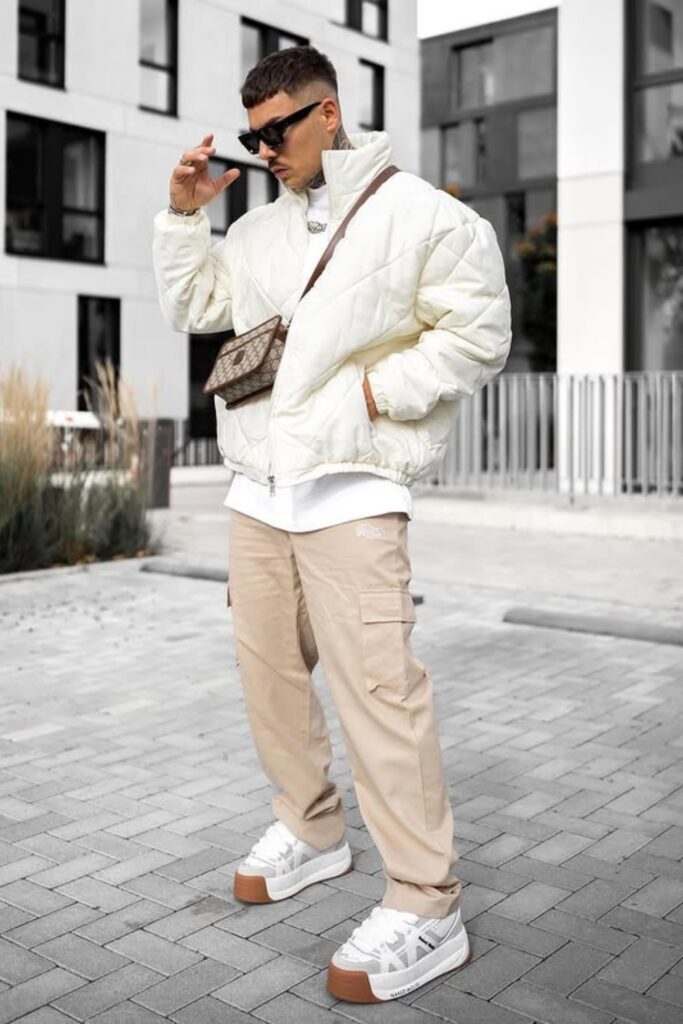 When volume stays at the top, puffer jackets look best. Straight cargo pants and platform sneakers keep the outfit grounded visually.