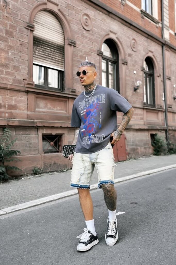 The distressed shorts and simple sneakers keep the appearance grounded, so the bold graphics don’t look like costumes or too much in real life.