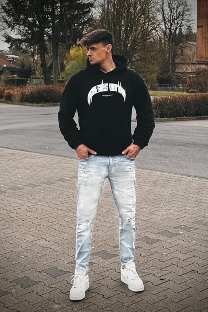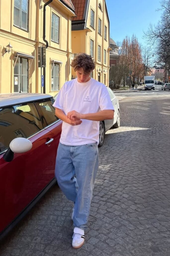 A clean tee and relaxed jeans show that streetwear doesn’t need layers; it just needs the appropriate fit and attitude to look trendy today.