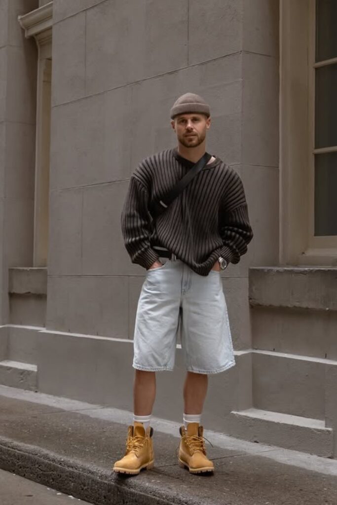 Shorts look like they were meant to be worn here since the heavier shoes keep the outfit grounded and stop the proportions from being too casual or sloppy.