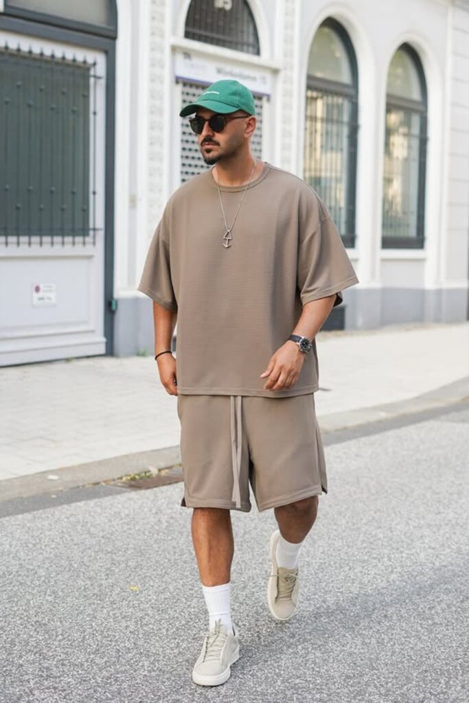 When shorts match the tone of oversized tops, the look stays casual instead of sloppy or reckless on hot days.