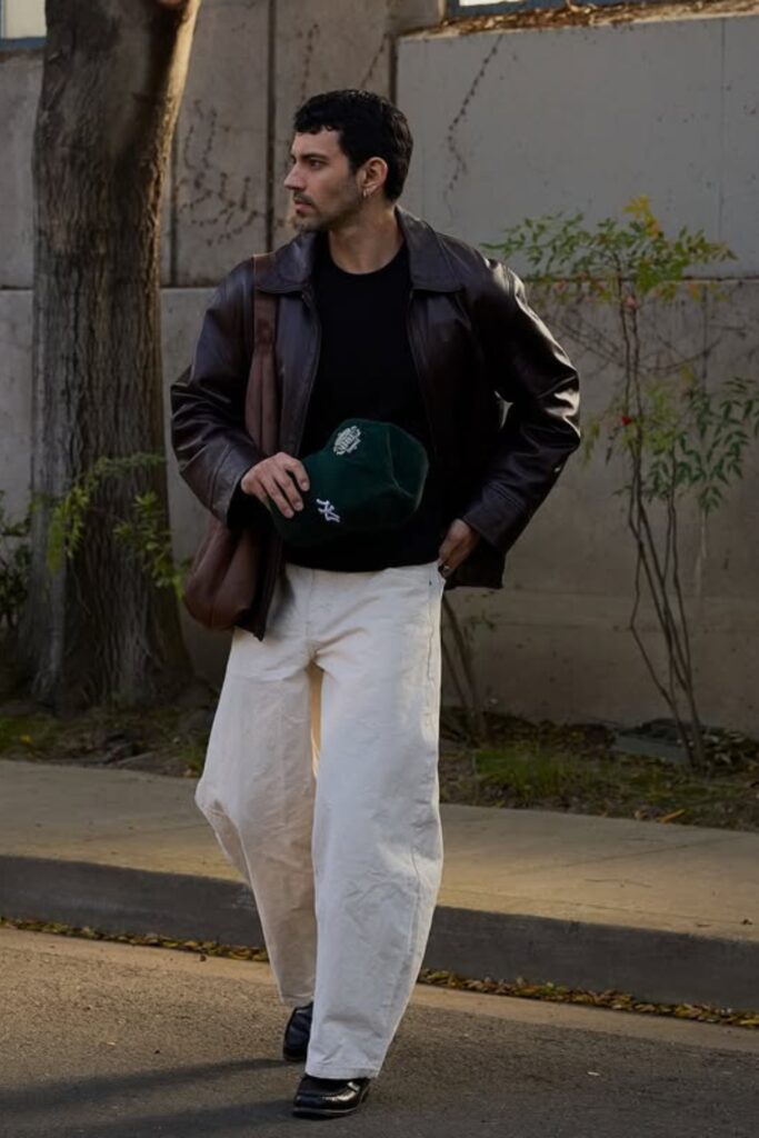 Leather jackets quickly make streetwear look better, especially when worn with light pants that make the contrast stand out and make men’s everyday outfits look better.