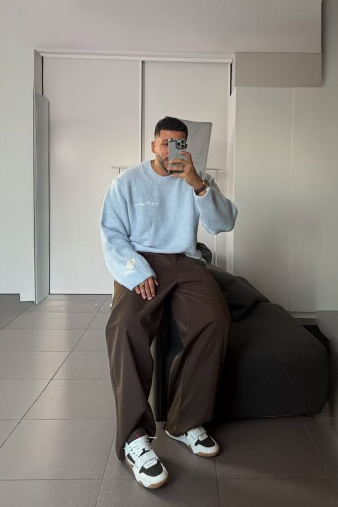 Oversized knitwear looks best when pants have structure. This keeps casual tops from making your frame look too big in everyday streetwear outfits nowadays.