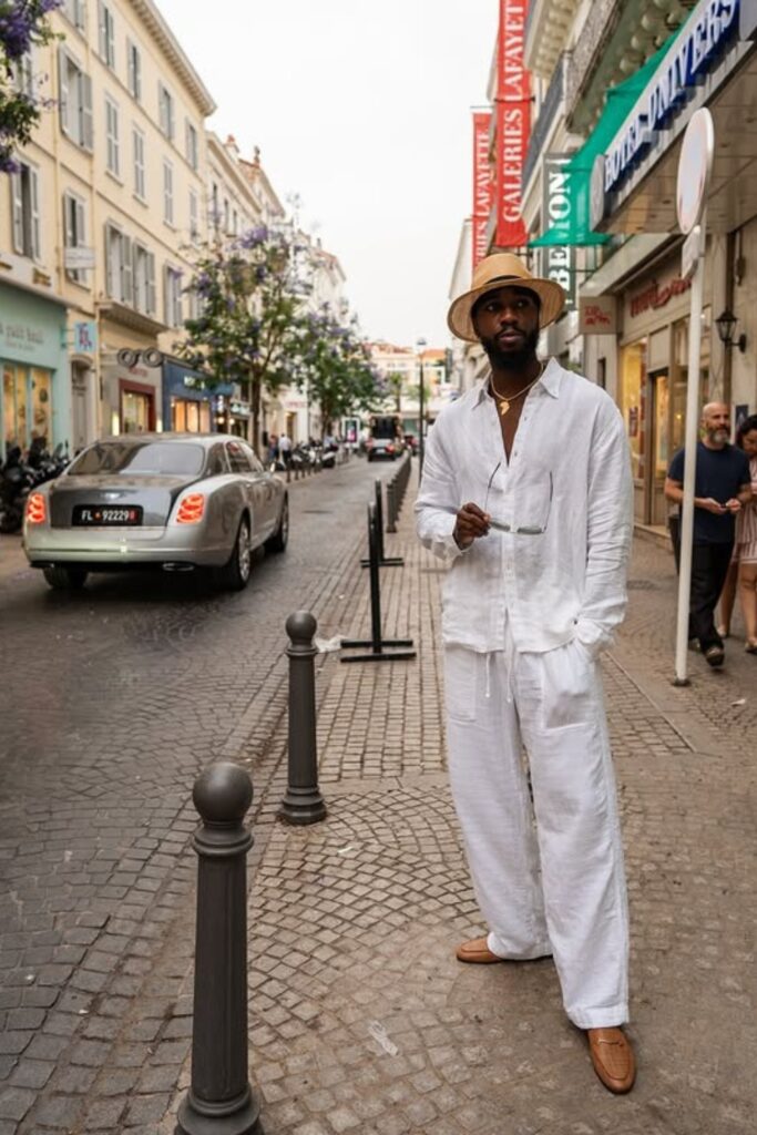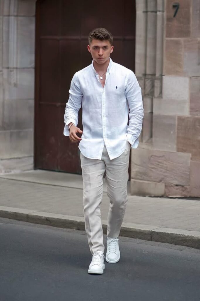 Loose white pants and a linen shirt reflect light brilliantly, keeping the whole appearance fresh during extended walks during the day.
