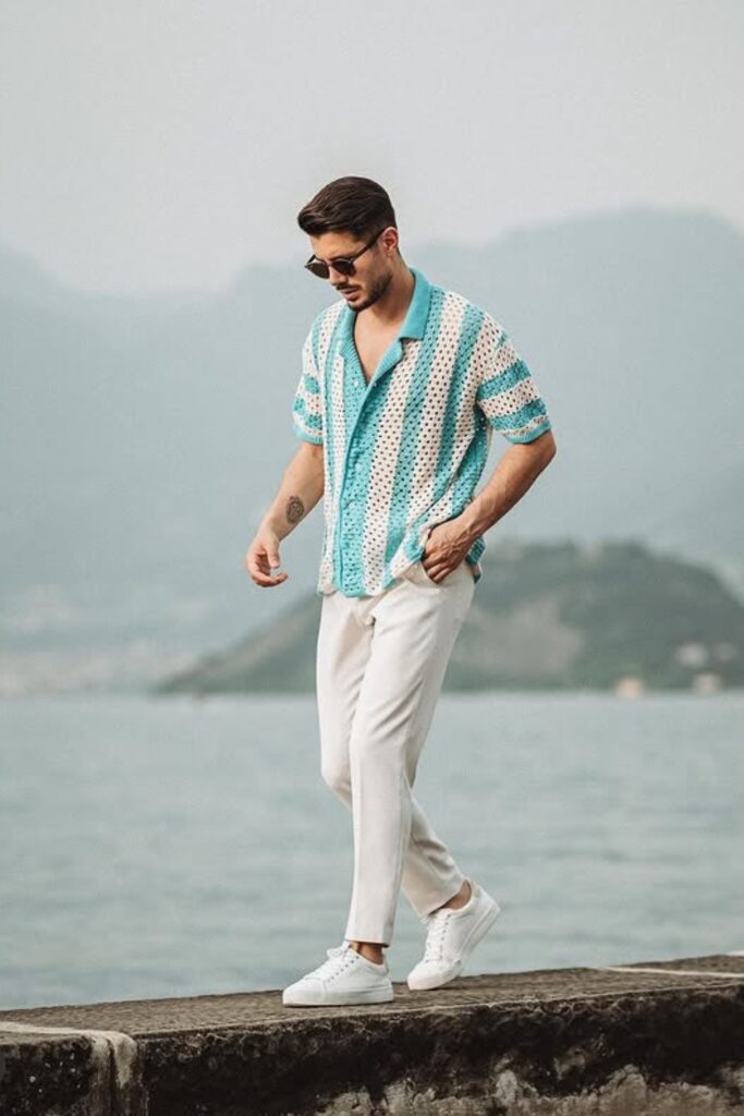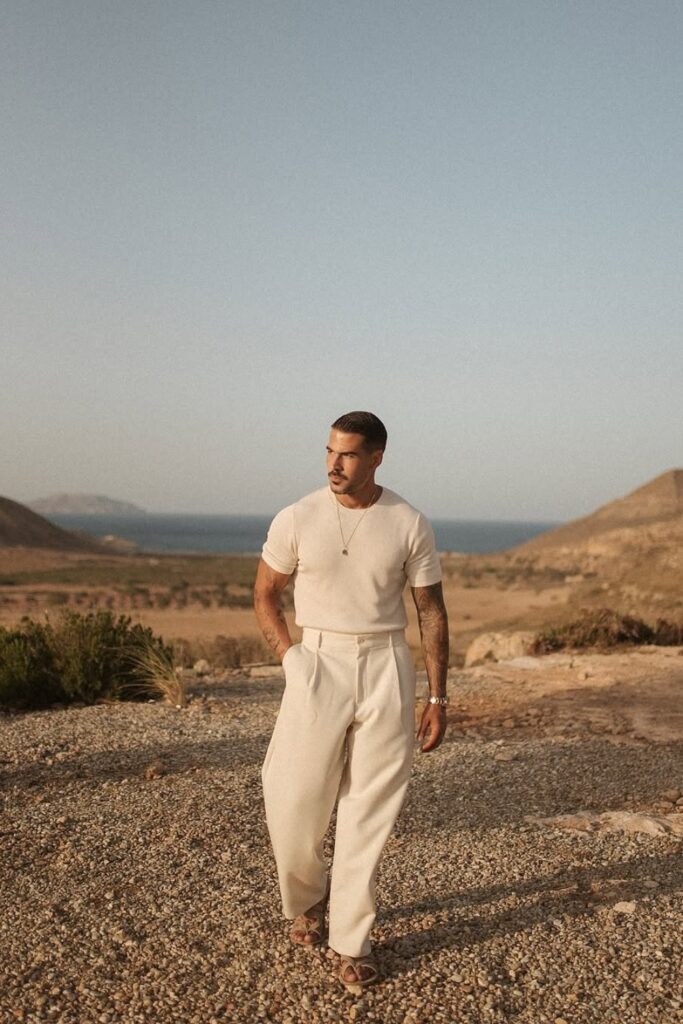 Nothing feels better than wearing a light white shirt and neutral pants that reflect sunlight and keep the look fresh while you’re near the water.