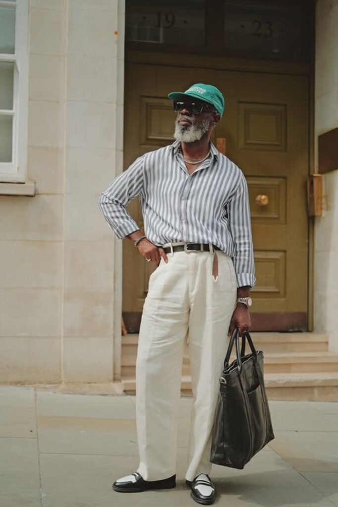 A light striped shirt instantly makes a summer ensemble feel like a vacation, especially when warm textures and loose fabrics combine well in the sun.