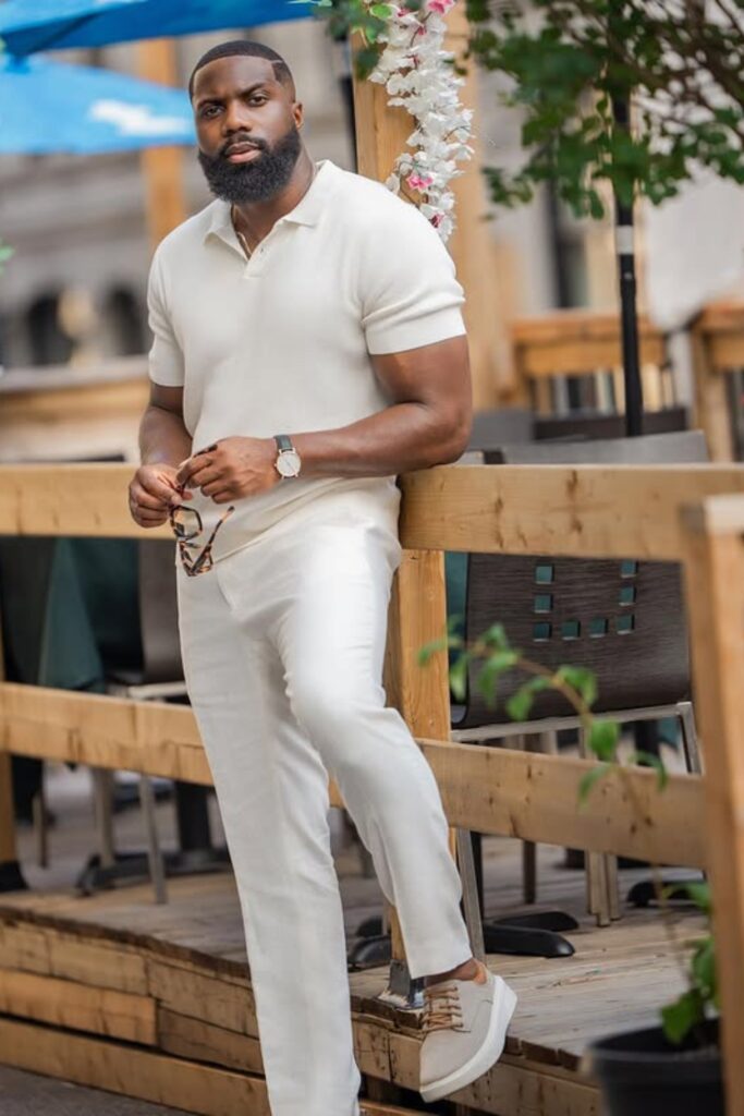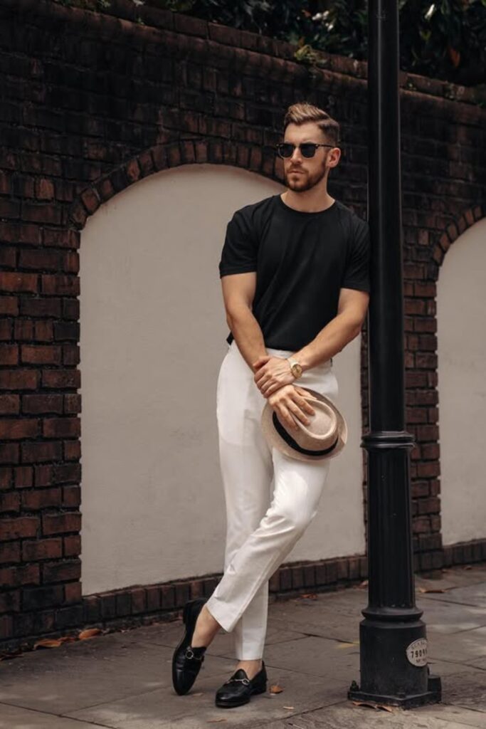 A fitted black T-shirt and pristine white pants that make a strong visual contrast are the best way to make a summer outfit look better.