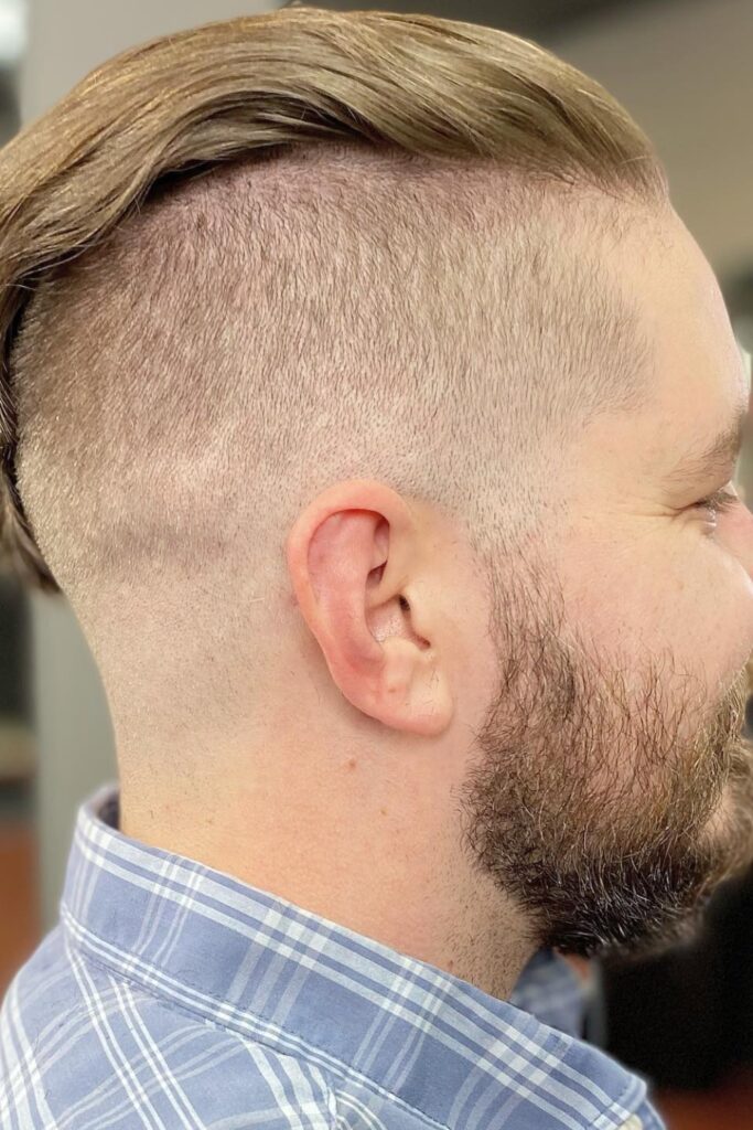 The large, brushed-back top gives the hair height and shape, which makes a strong contrast with the shaved sides.