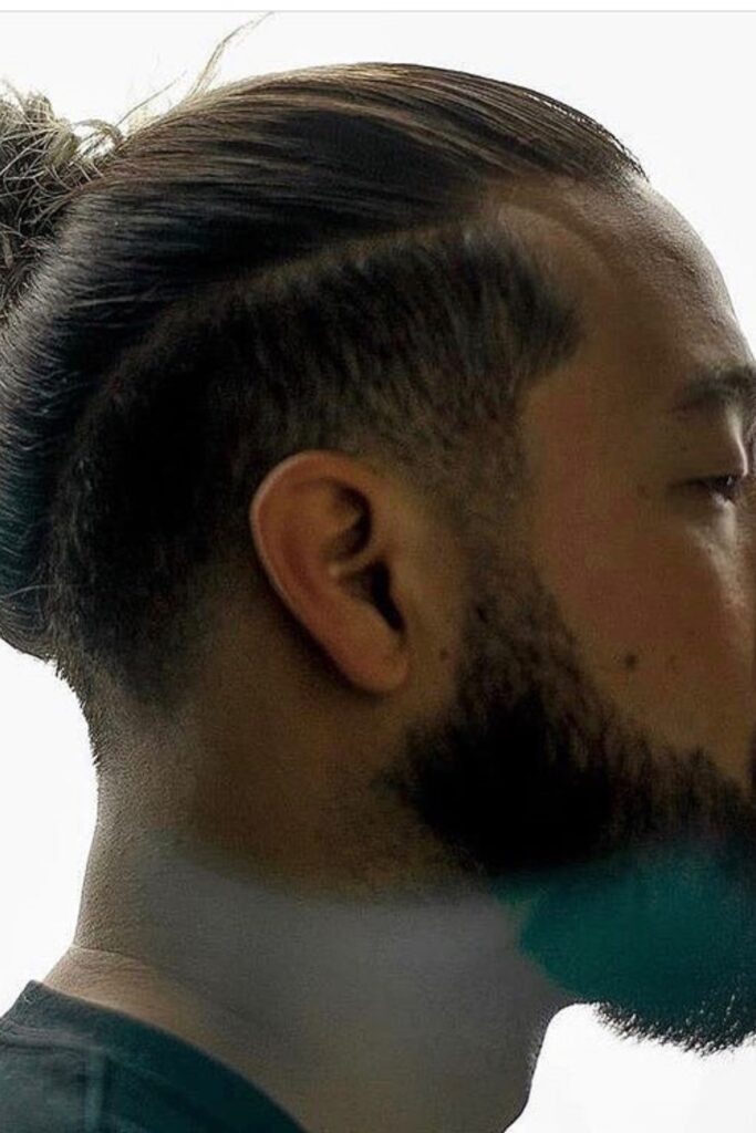 The top is twisted firmly into a small knot, and the sides are shaved to show off the scalp. This makes the full beard stand out.