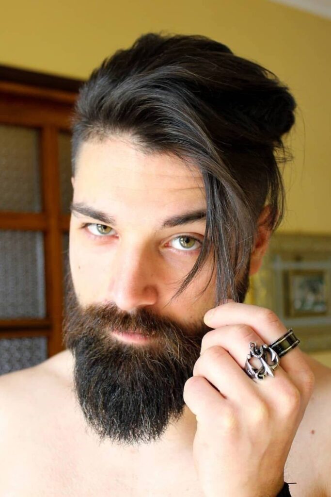 It looks best on medium to long hair and goes nicely with a full beard for a manly look. Before putting your hair in a tidy bun, use light-hold style cream to keep the strands smooth.