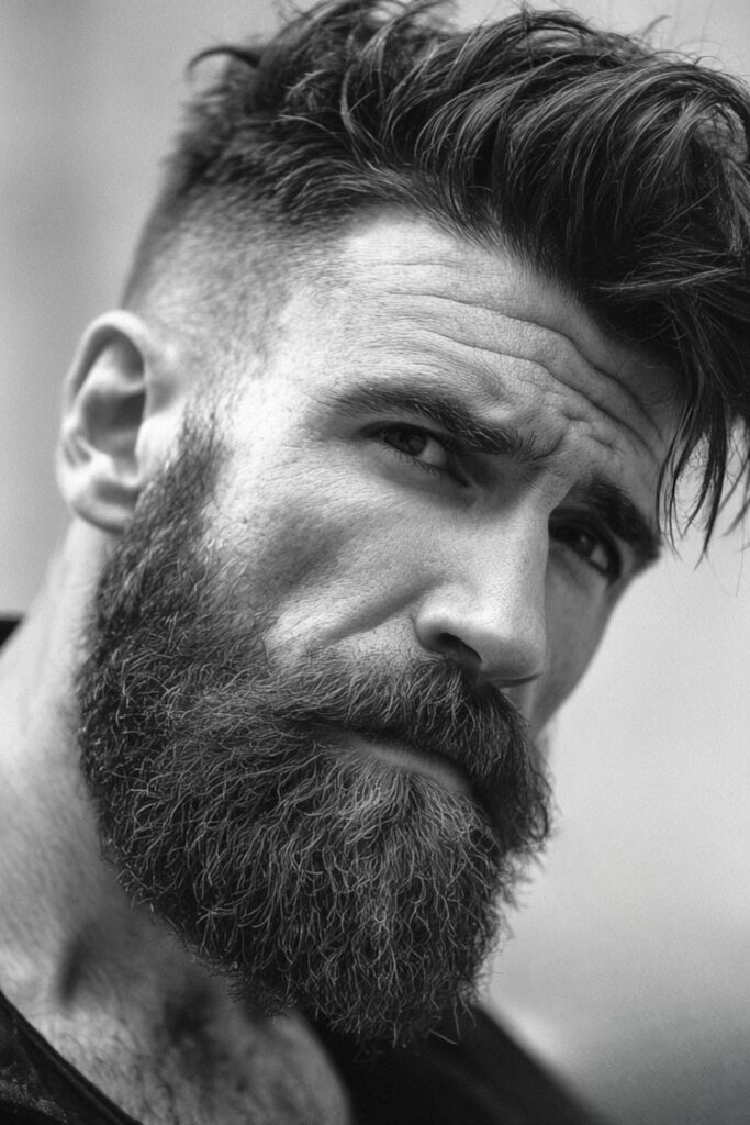 This rough undercut stands out because of its textured top and full beard. It looks raw and manly.